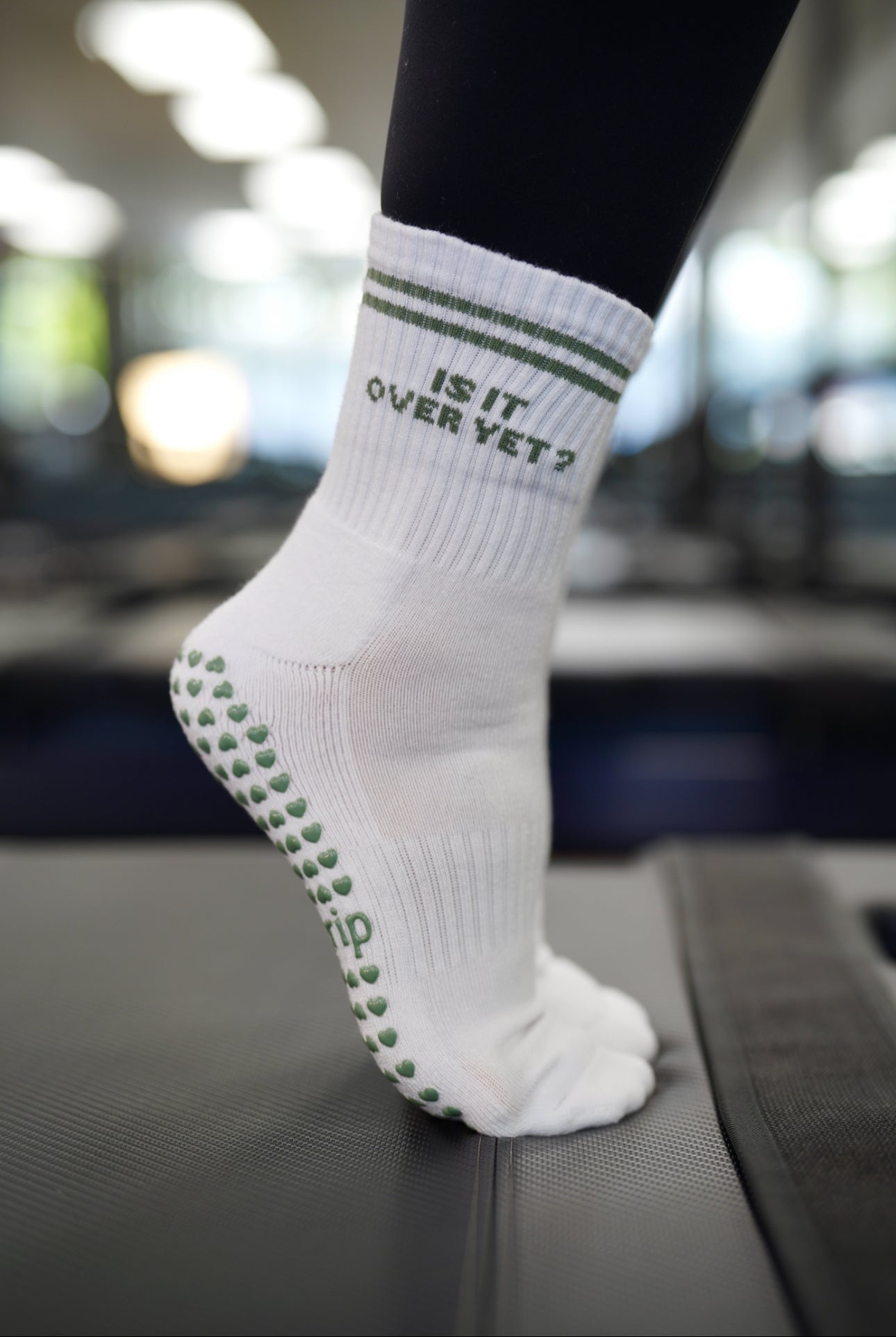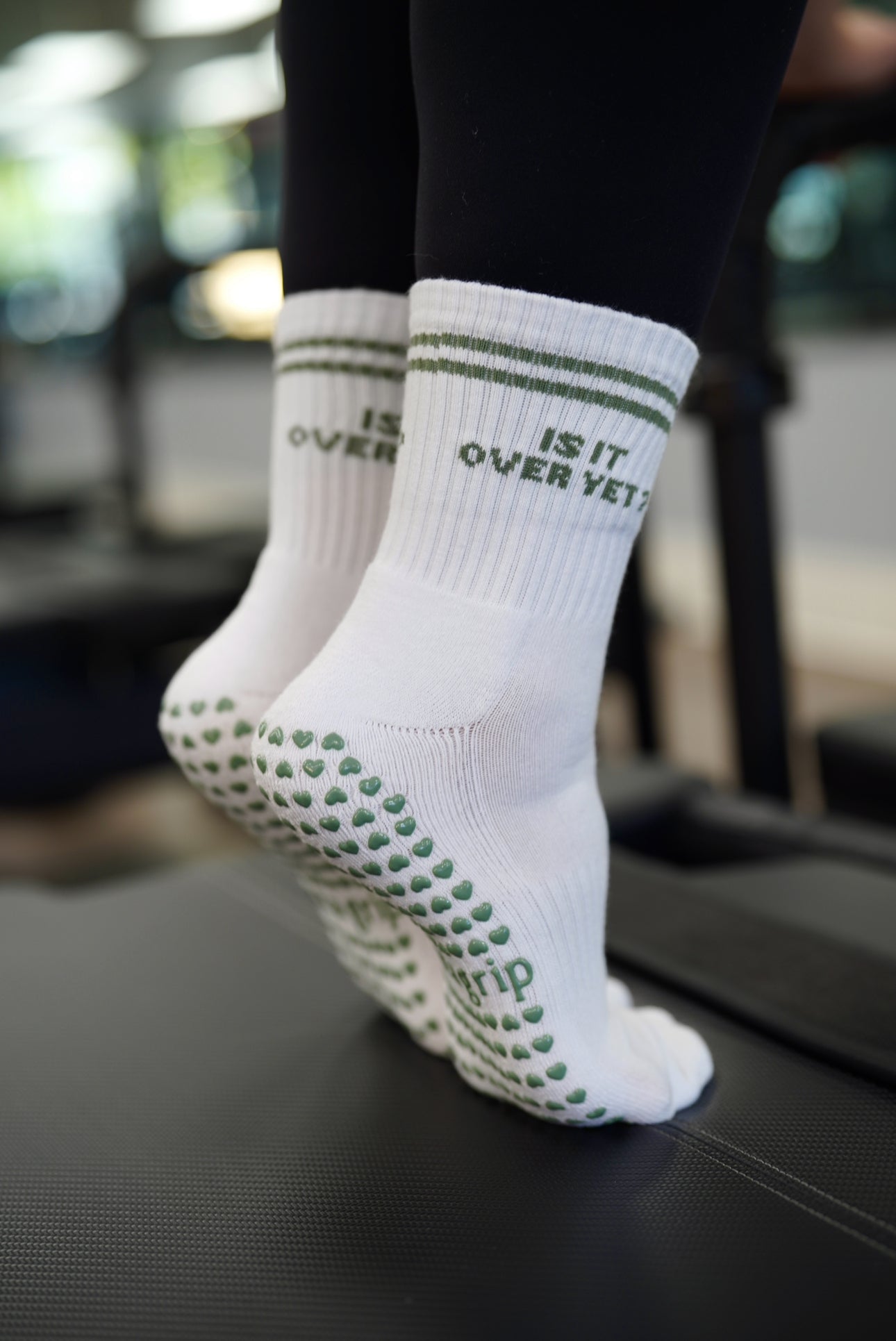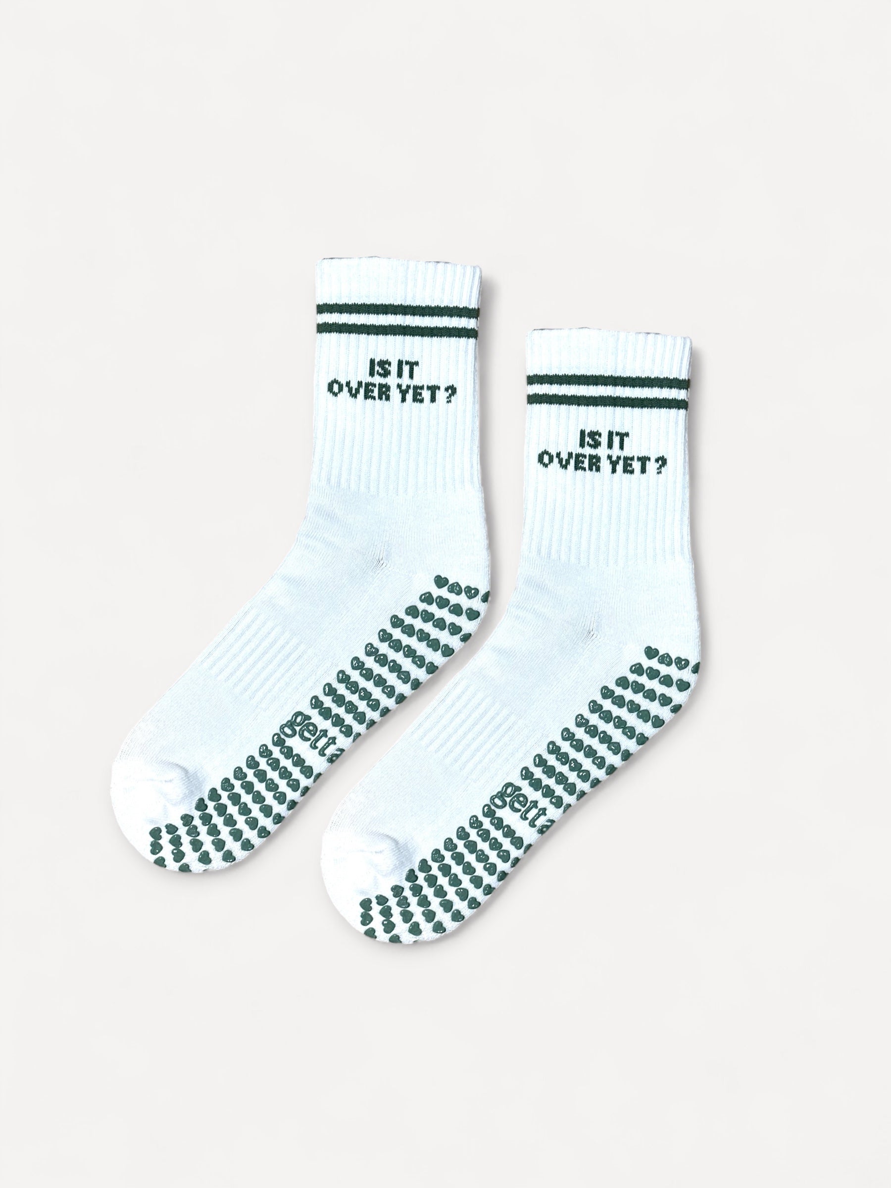 our first all-woven sock in an all classic white crew sock with sage green stripes and woven text saying "is it over yet?" on both sides of each sock, paired with our signature heart grips.