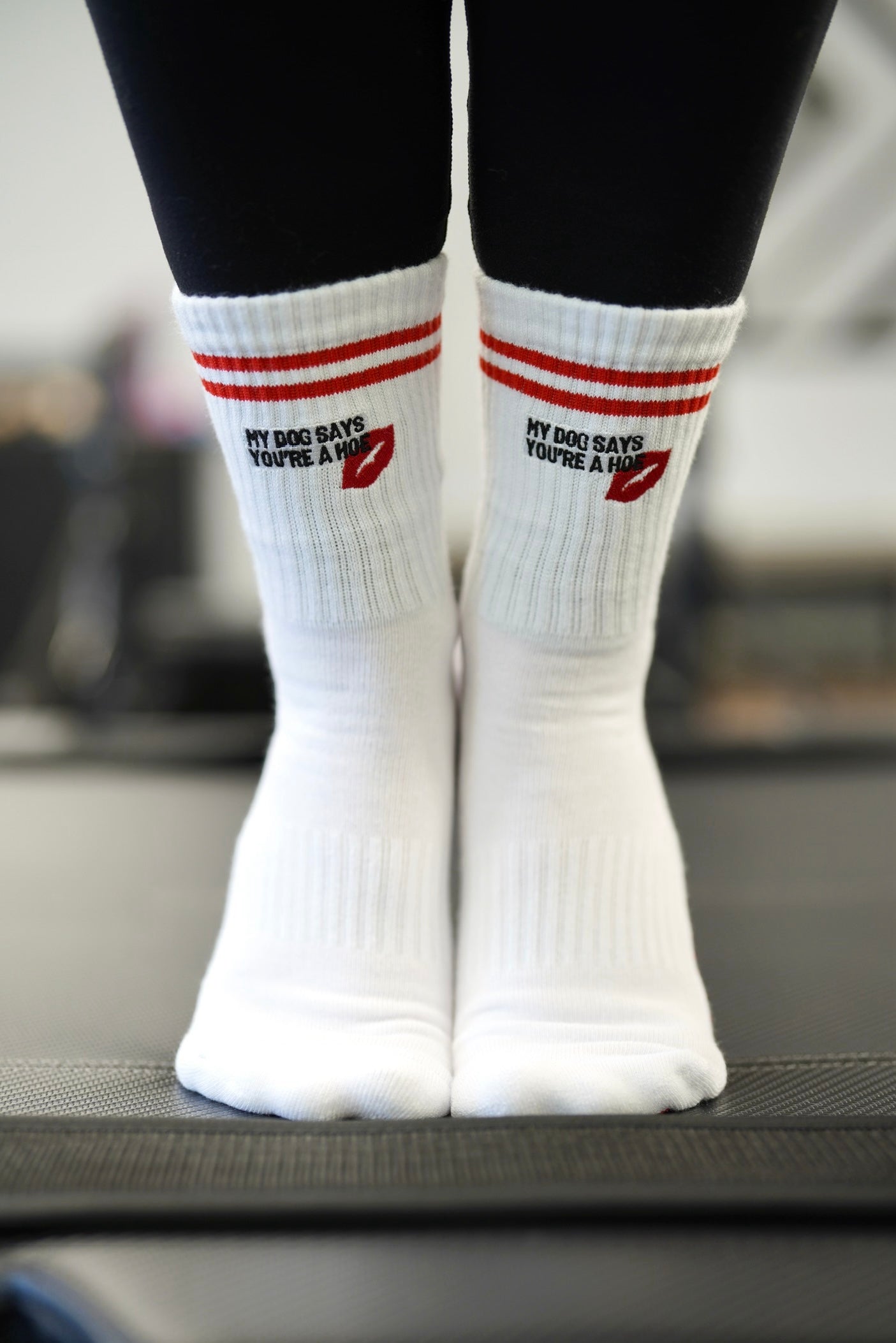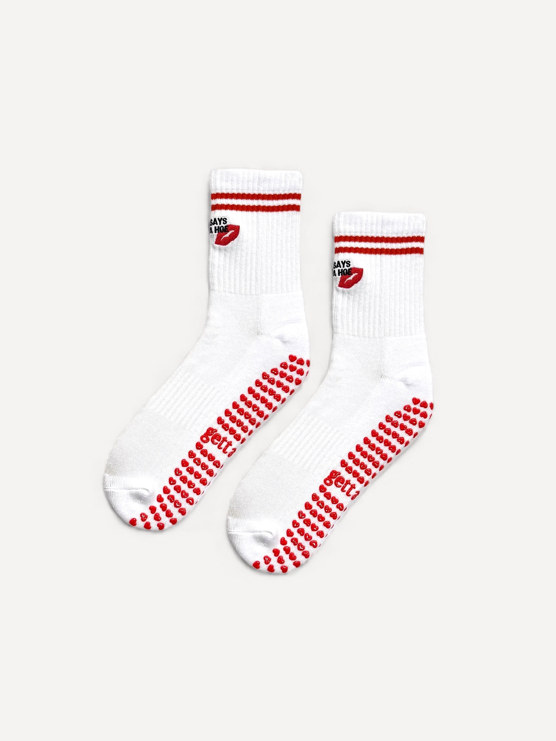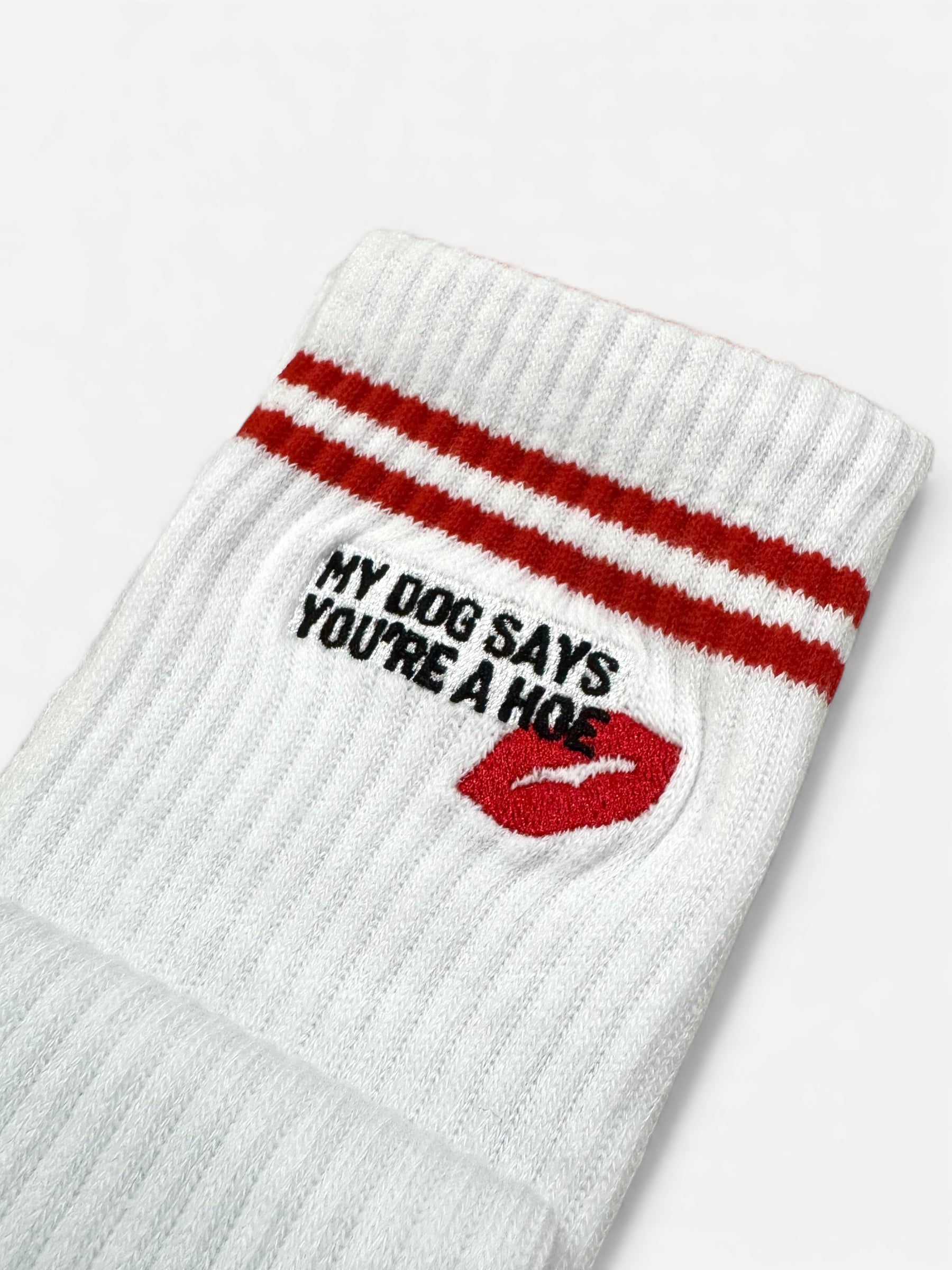 "my dog says you're a hoe" textbox embroidered with a red lips for some extra sass on a classic white crew sock with true red stripes and matching signature heart grips.