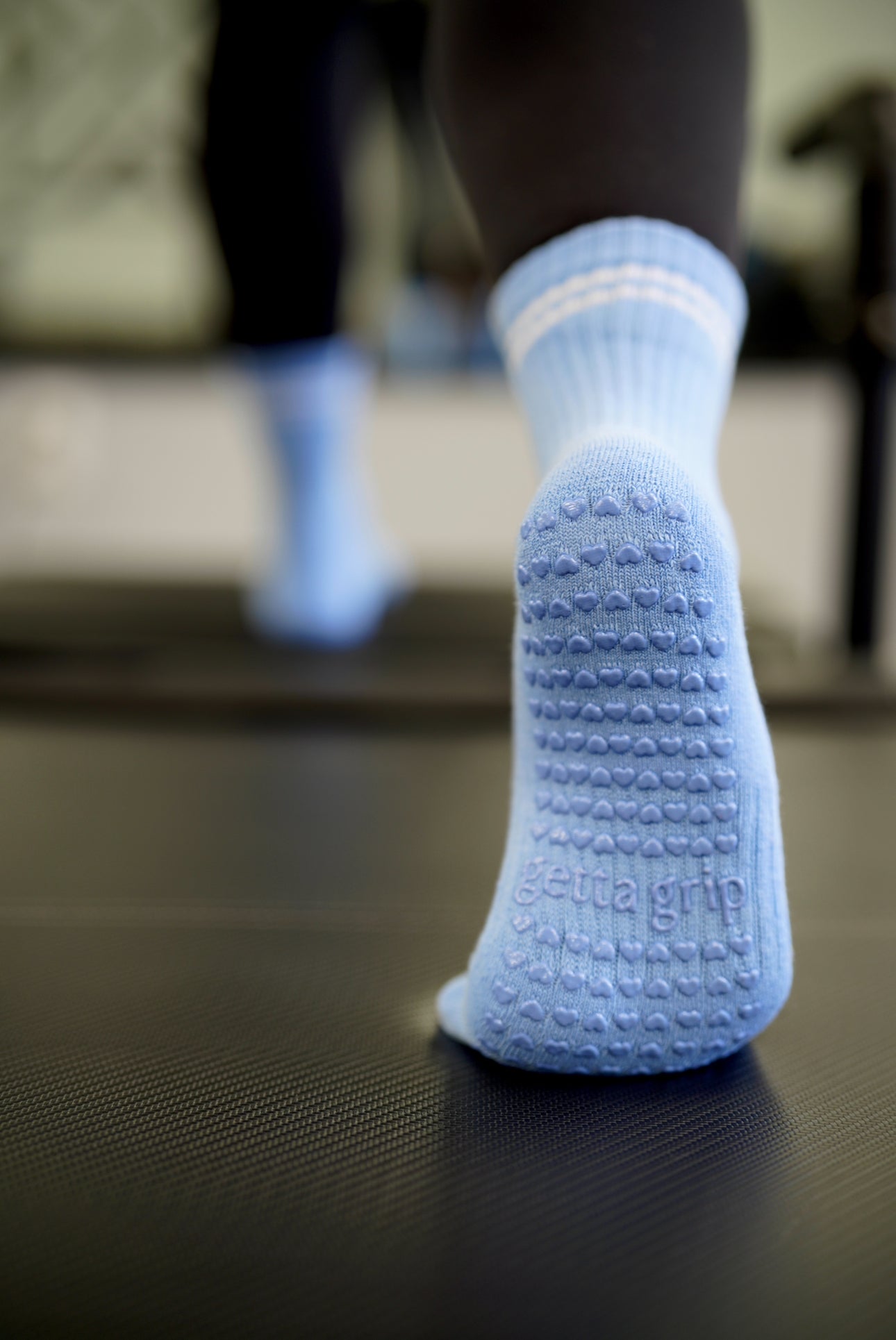 centered on the front of a cerulean blue classic crew sock with white stripes and monochromatic cerulean blue signature heart gripsĀ
